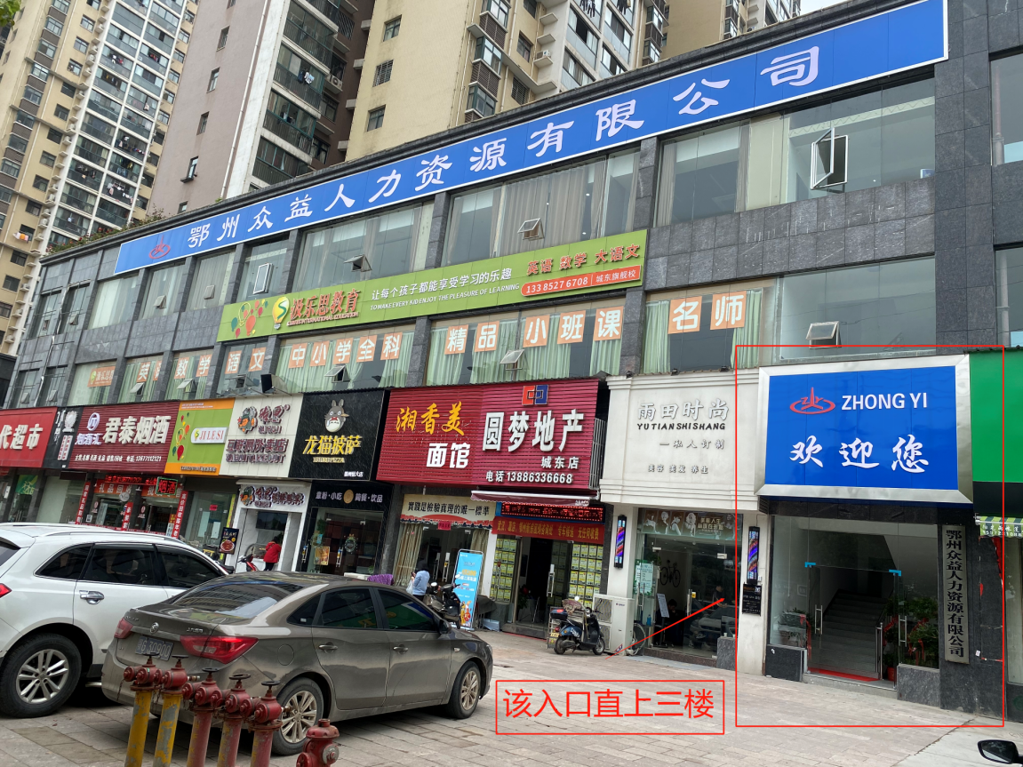 2、驾车可直接导航“鄂州众益人力资源有限公司”,公司位于金州星城小区正大门往南(驰恒之城方向)50米。